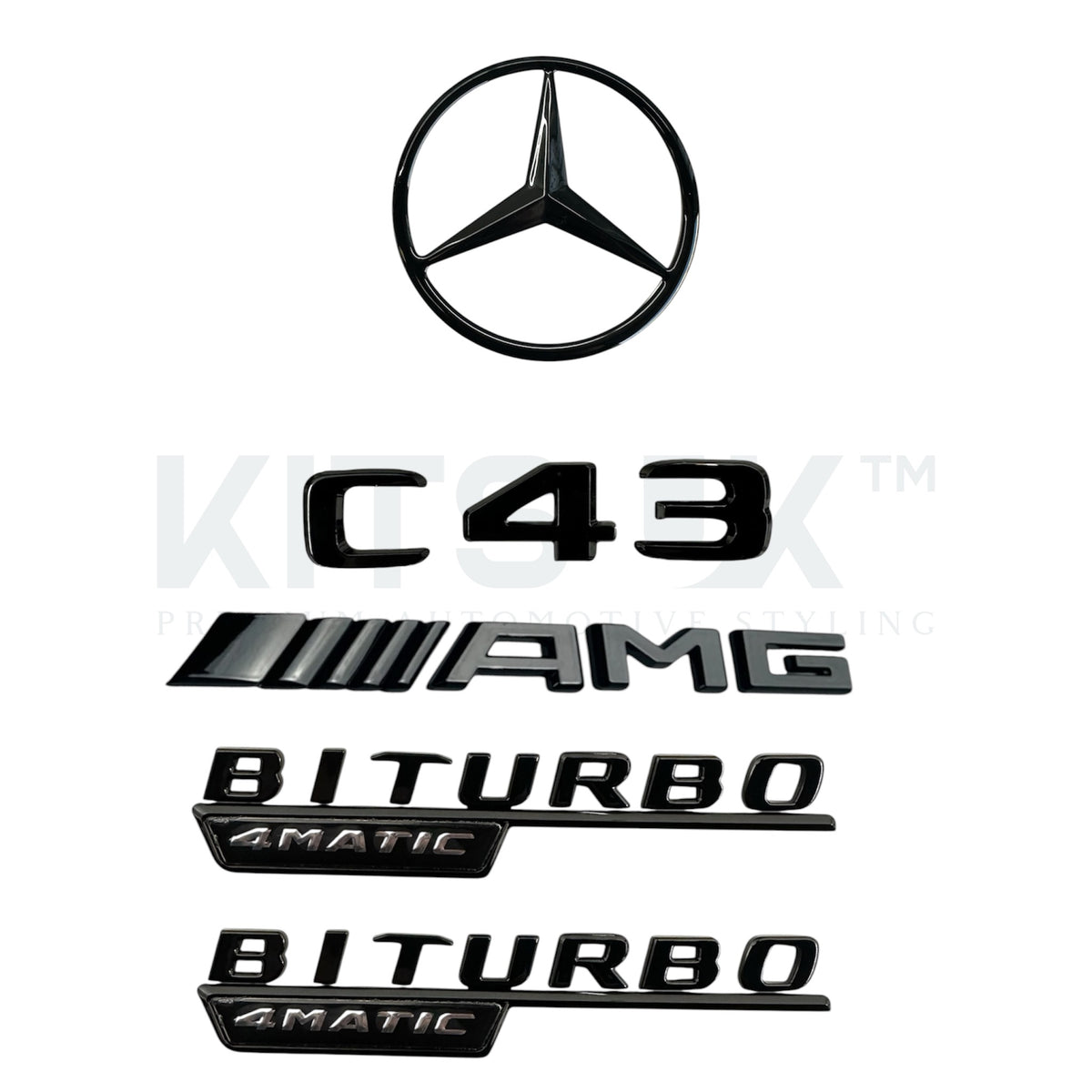 Mercedes W205 C43 Black Badge Package featuring Gloss Black AMG and Biturbo badges for upgrade.